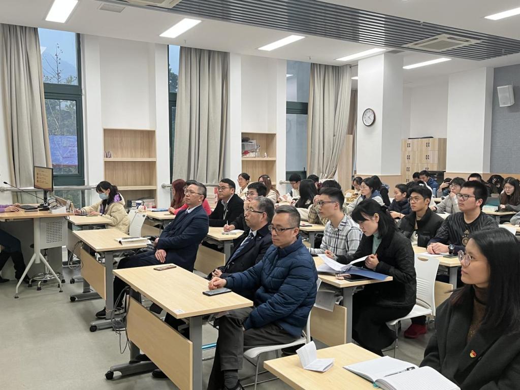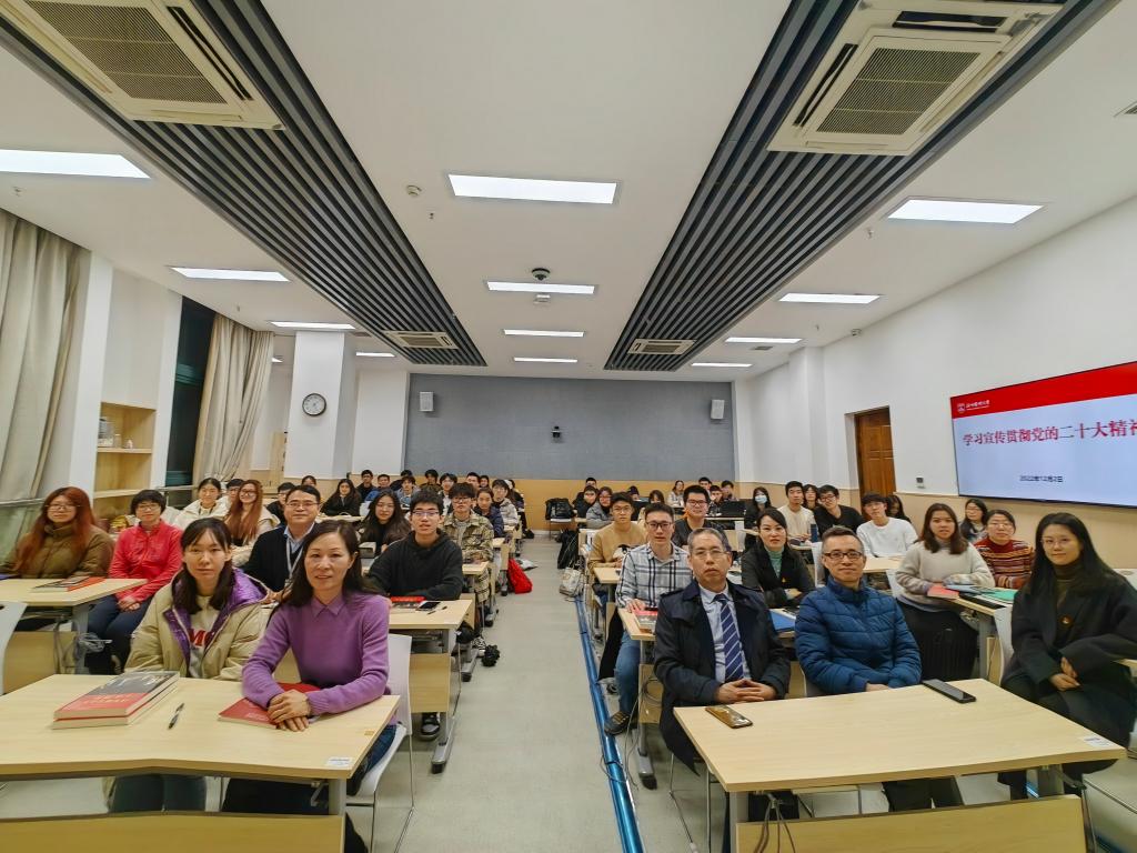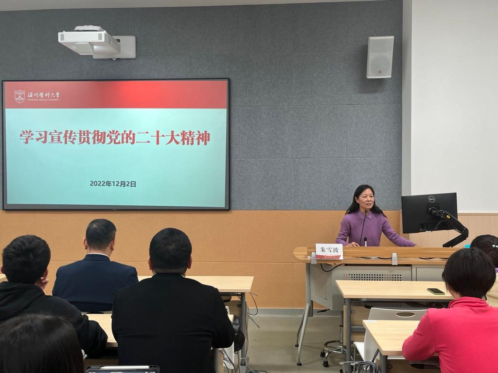 12月2日下午,校党委委员、教务处处长、拷贝漫画 副院长朱雪波在生物医药科研楼为学院60余名师生作党的二十大精神宣讲报告。学院执行长阮积晨、校教务处副处长金伟琼、学院副院长王小尚、院长助理陈钢、陈浩出席。
