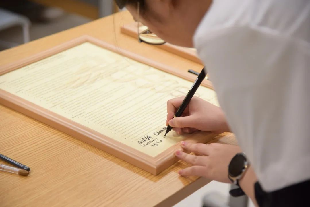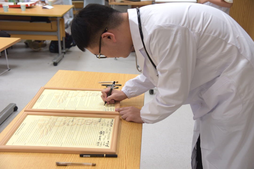 随后,同学们纷纷在共同缔结的医学誓言书上,郑重地签下了自己的名字。