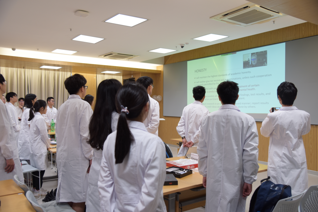 活动中,Tracey Hillier教授和Carol Hodgson教授带领同学们共同庄严宣誓。与以往医学生宣誓所使用的《希波克拉底誓词》或《中国医师宣言》不同的是,本次宣读的医学誓言是由同学们集体起草完成的,涵盖了诚实、尊重、保密和责任四个方面的内容,总计包含30项条款。除了医学誓言的基本职业道德要求之外,还囊括了学术学风、朋辈氛围、职业态度等多方面行为准则的详细规定,展现了同学们作为新时代医学生的庄严承诺和对医生这一职业新使命和新责任的崭新理解与自我约束。