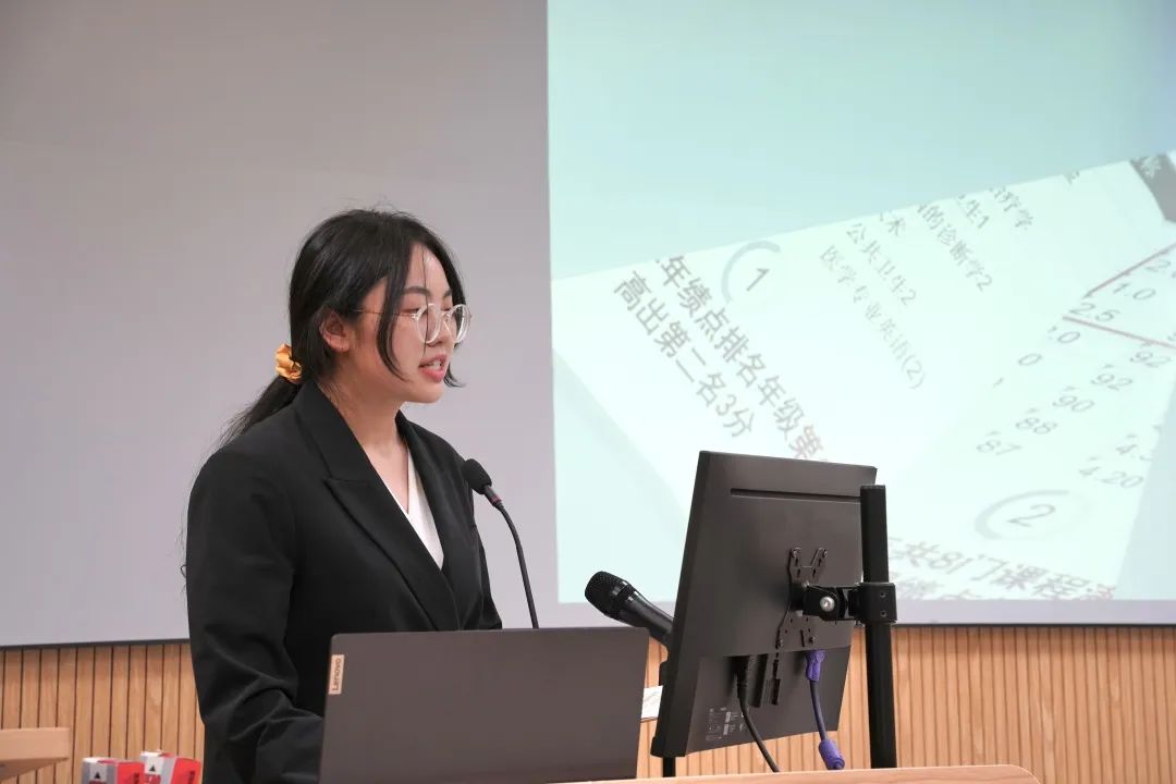 李亚宁同学成绩优异,在绩点排名年级第2、首考雅思7.5的基础上,不断提升自己的专业素养和英语水平。在课余时间,他还积极学习重症医学的知识,注重培养自己的临床和科研思维能力。他以幽默激情的演讲感染着现场的每一个人。曾因体测错失省奖评比机会的他在过去一年中注重个人体魄强化,并取得了显著进步,让自律生活成为“跳出自我内耗”的正反馈调节机制。