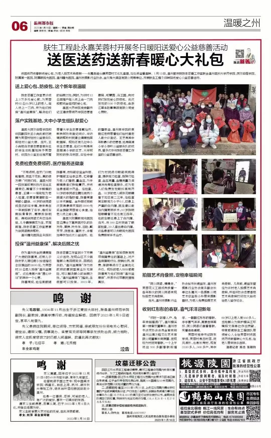 寒假期间,我院白求恩志愿者服务社赴永嘉县芙蓉村参加“肤生工程”爱心义诊活动,与学校药学院、附属第一医院、第二医院、眼视光医院,温州都市报陈忠慈善工作室、温州曙光医院、温州市摄影行业协会的专家一道,为当地群众送医送药送健康,送上新春的第一抹温暖。