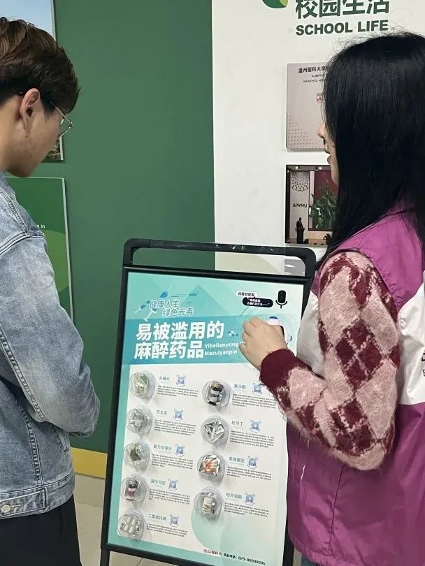 志愿者们在教室门口摆放各类毒品的展览板,并准备了精美的小礼品,吸引了众多同学和老师。通过扫码学习和知识问答互动,大家对毒品有了更深的了解、认识到了毒品的危害,提高了拒绝防范和自觉抵制的能力。