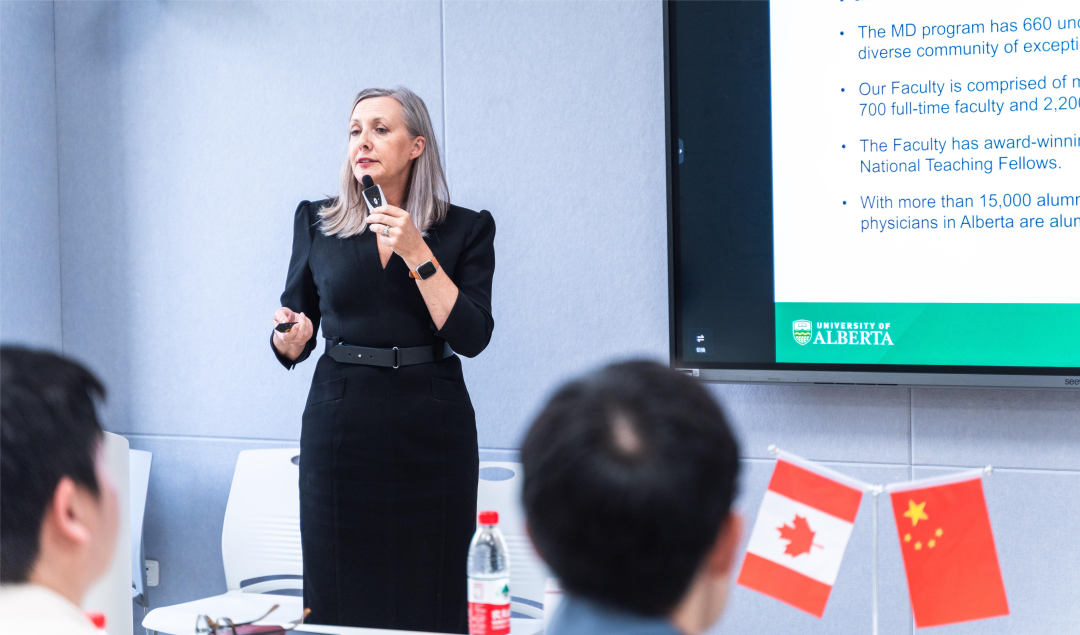 特雷西·希利尔老师首先回顾了加拿大医学教育的关键阶段,并就中加医学教育的异同点分享感悟。她总结加拿大医学教育实践,将其划分为临床医学博士学位院校教育、住院医师规范化培训教育、执业医师继续教育三个前后密切衔接的关键阶段,同时指出中加医学教育实践的区别主要体现在院校教育的招生对象、录取环节和住院医师规范化培训的学科类别、学制年限。她表示参与阿尔伯塔大学与拷贝漫画 合作建设临床医学(中外合作办学)本科项目的过程中,曾深入分析中加两国临床医学学位的招生录取政策、职业规划调研、执业医师资格考试大纲等相关资料,为实现项目在地国际化建设思考方案并付诸努力,因此特别能够体会中加教学管理人员调研分析、匠心育人的经历。