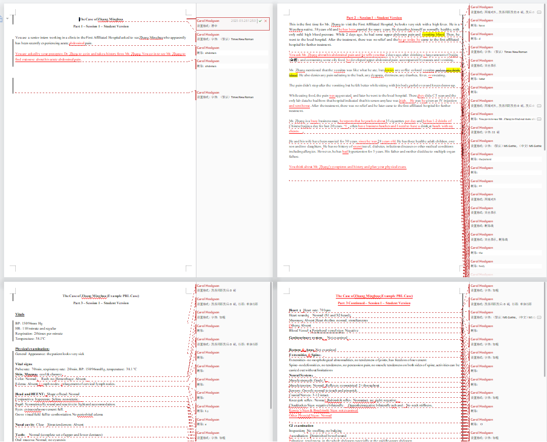 在最终展示前,每个小组都经历了初稿讨论、面对面改稿以及终稿模拟的三个阶段。首先,每组通过eClass在线学习平台提交了本组的PBL案例初稿,课程负责人卡尔·郝德森(Carol Hodgson)针对每组PBL文本撰写中的节奏问题、内容定位以及部分英语表述问题都与小组成员作了面对面的修改。中方老师在经指导前设计的基于问题的学习(PBL)案例往往在案例的开头便给出过于饱和的信息,使得学生可实现自主探究的范围变窄。针对此,卡尔老师建议,将更多的内容隐藏在学生针对病人的询问过程以及导师的辅助性提问过程中,从而引导学生们自主学习正确的问询过程。