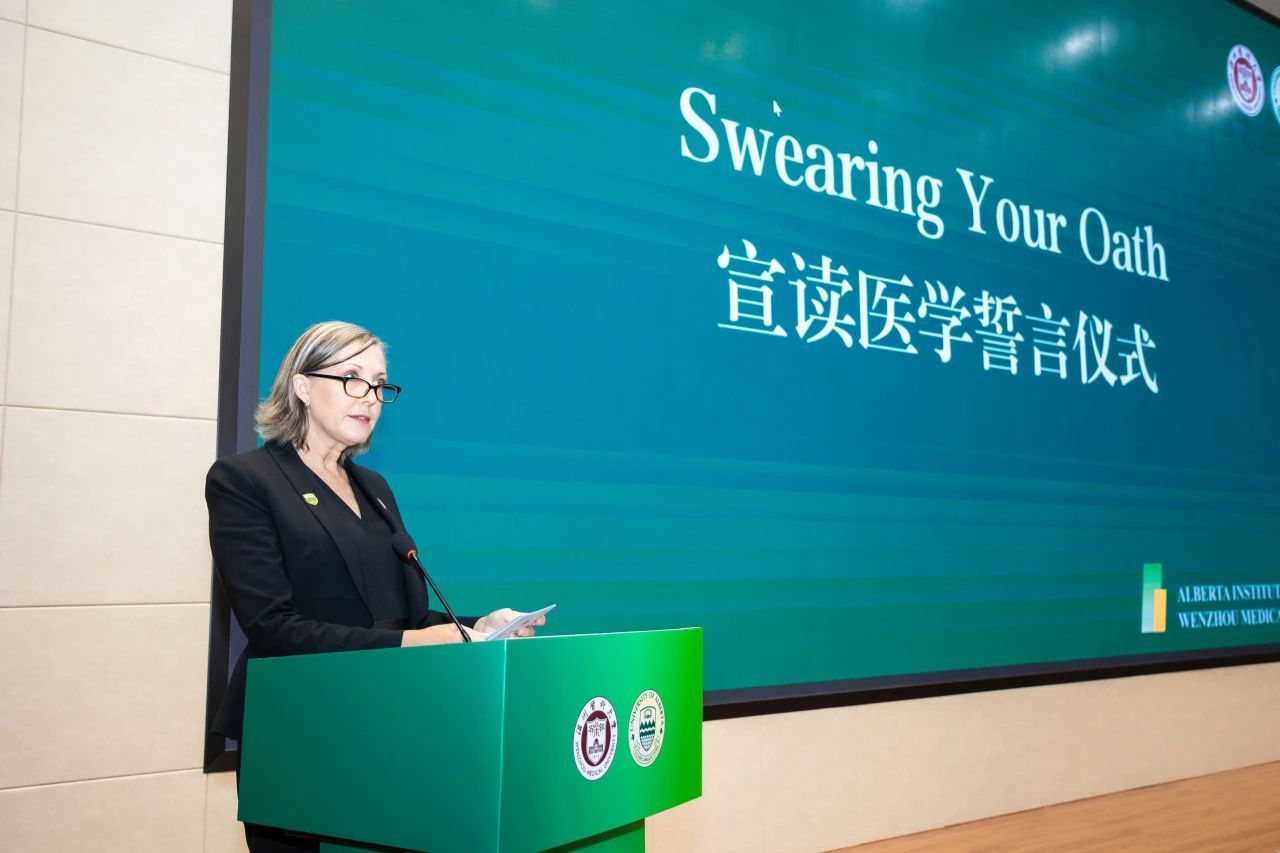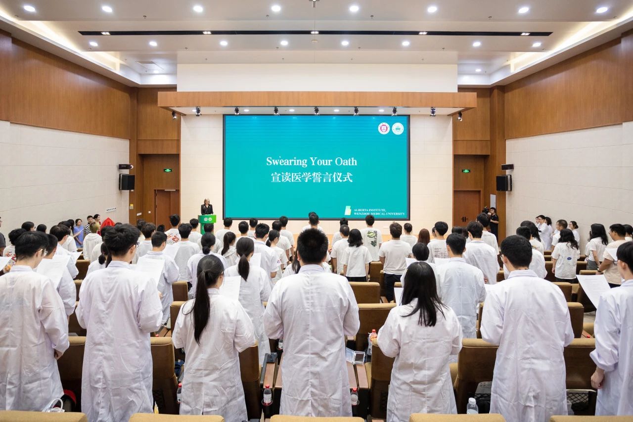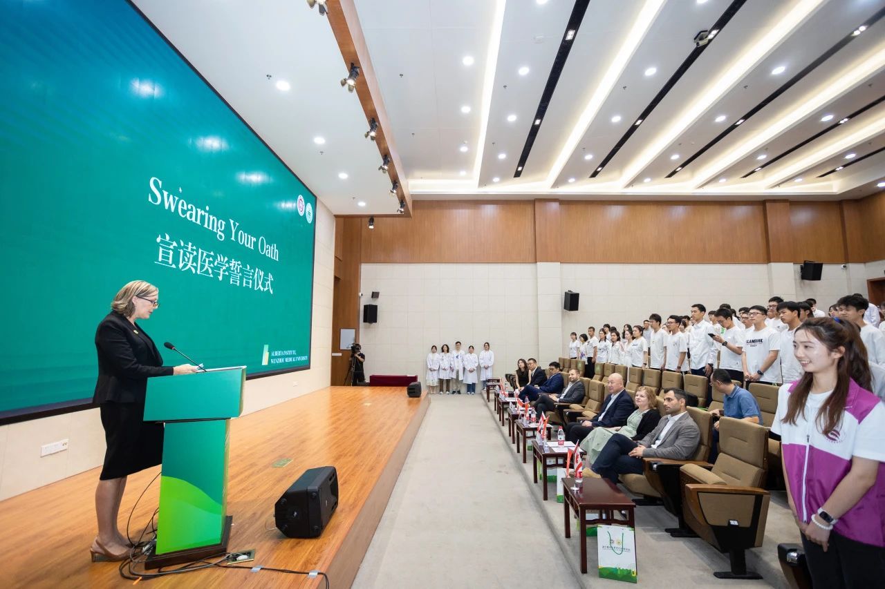 随后,全体同学们在Tracey Hillier教授的带领下,齐诵临床阶段医学学习及职业准则誓言,铿锵有力的誓词时刻提醒着同学们,未来的从医之路要遵守学术规范,积极参与个人、小组或临床环境下的各项学习,矢志不渝提升医疗质量和服务水平,肩负起医学的使命与对全力救治病人的承诺。