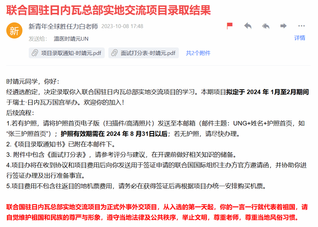 在征求身边家人、朋友、老师和同学的意见并获得了一致支持后,我果断报名参加了活动面试。面试内容主要包括英语自我介绍、讲述报名参与活动的初衷和回答一些有关联合国工作架构等问题,对于有过模联经历的我来说并不算很难,因此我在十一假期前面试,假期结束后就顺利拿到了项目录取通知。