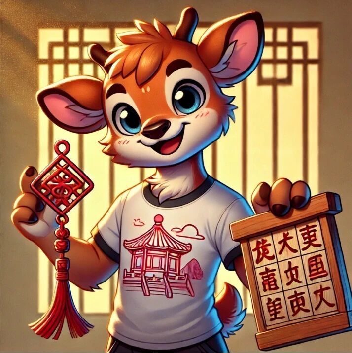 这张图的设计灵感来源于传统的中国文化元素与温医大吉祥物的结合。图中的小鹿穿着印有传统建筑图案的白色T恤,展现了中国传统建筑的美丽与简洁。T恤上精致的建筑图案不仅突出了传统文化,还与小鹿的形象相得益彰,展现出活泼、可爱的氛围。小鹿手中左握中国结,右手持有木活字印刷板,完美结合了传统手工艺与现代设计。中国结象征着吉祥与祝福,而木活字印刷板则传递着中华文化中对传统艺术与手工技艺的传承与尊重。这种设计不仅表现了对传统文化的热爱,也让人物形象更加生动有趣。整体色调温暖,背景柔和的光线和细腻的阴影,营造出一种温馨的氛围。小鹿那双大眼睛和灿烂的笑容增添了无限的童趣,使这幅作品不仅具有艺术性,还散发着一股令人愉悦的气息。这张插画在设计上巧妙融合了中国传统元素与现代卡通艺术,通过色彩的运用与元素的搭配,成功地传递出一种既有文化底蕴又不失现代感的视觉体验。