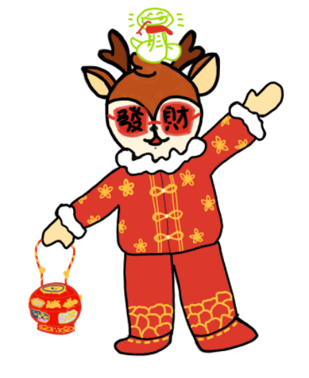 希望能够将蛇年、非遗、校园吉祥物三种元素融合在一起,打造一个福气满满的形象。鹿的衣服上是中国传统剪纸艺术剪的以蛇为造型盘旋成的“2025”字样,衣袖两边和头顶是中国传统的寓意祥云。鹿头上带的帽子灵感取材自今年春晚撒贝宁样的蛇头帽,上面点缀有金元宝和金铜钱,希望大家福气满满,来财来财。鹿的两只耳朵上挂着中国传统中国结,上面写着“福”字,喜庆吉祥。整体色彩以红、金两色为主,更加喜庆,看着就开心。
