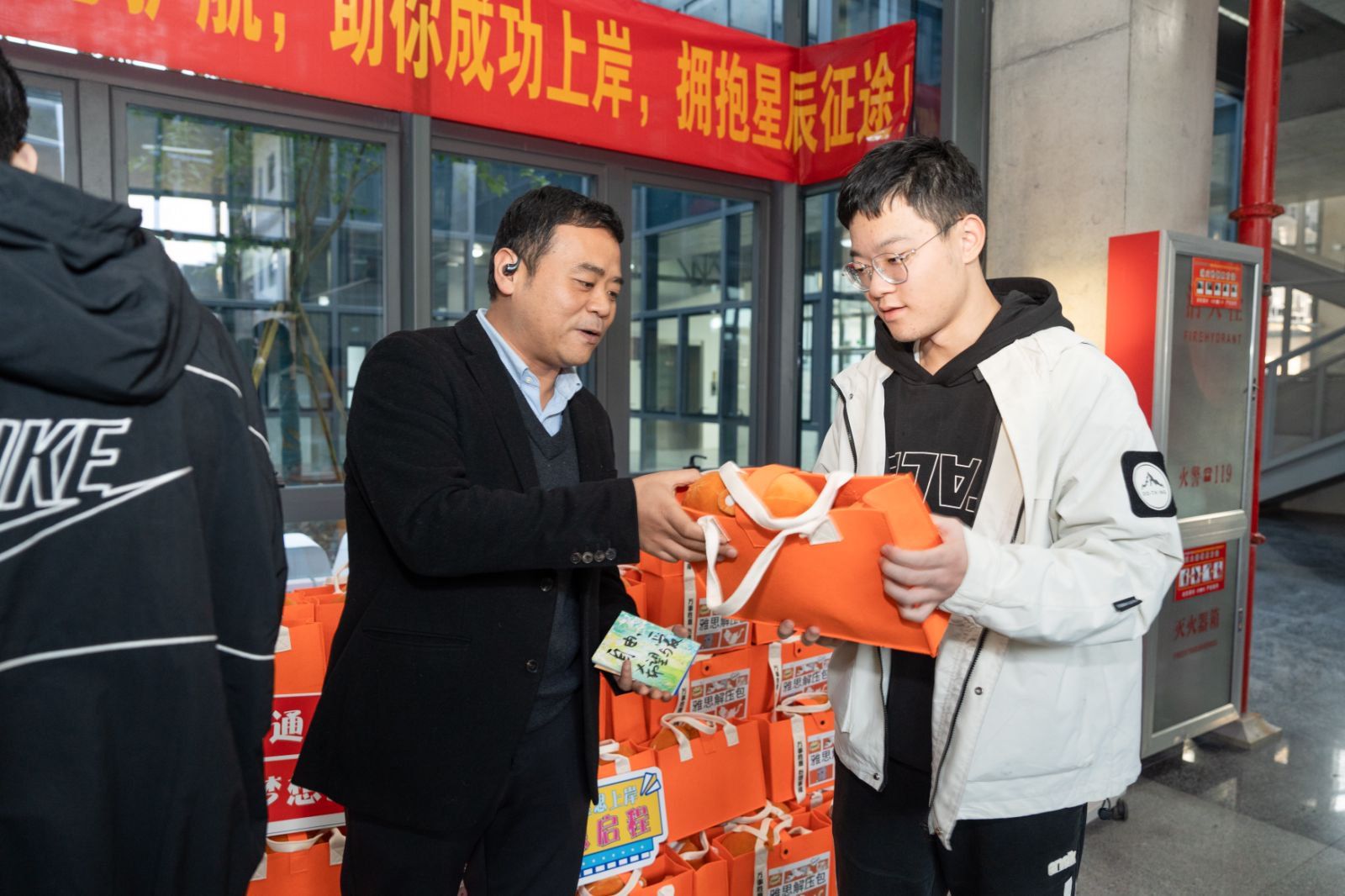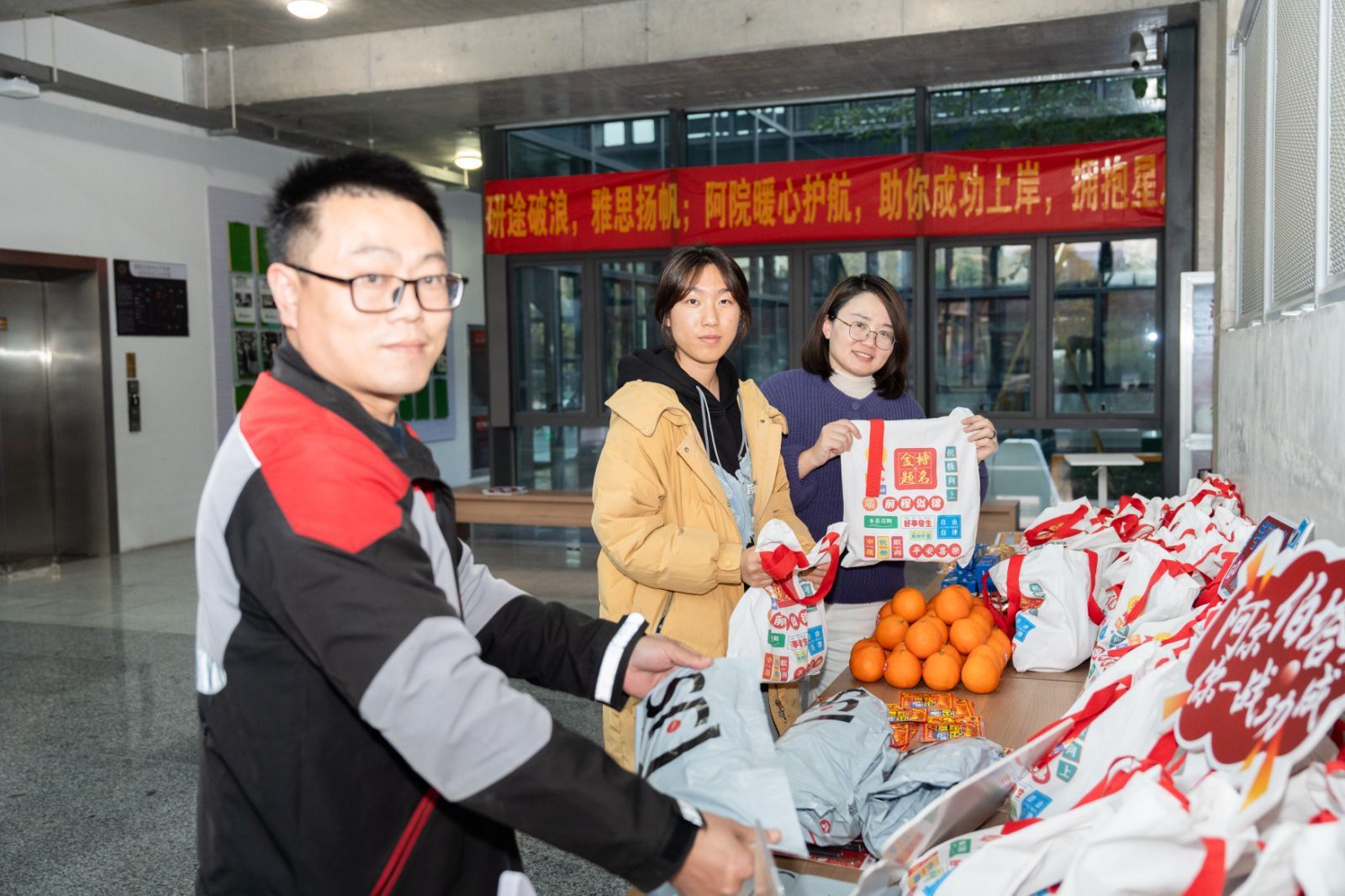 这份充满心意的加油物资里,藏着诸多美好寓意:印有“橙功上岸”的新鲜橙子,寄托着顺利上岸的祝愿;寓意“包过线”的小面包,寓意着稳稳过线、不负努力;“苦尽甘来”的咖啡,陪伴学子们熬过备考的艰辛岁月;“考运超旺”的旺仔牛奶糖,愿大家考试时好运加持;刻着“加油!奥里给”的奥利奥,是俏皮又有力的鼓劲;还有“暖暖的贴心”暖宝宝,”笔下生花“的考试用笔,为冬日备考的学子带来阵阵暖意。每一份物资都承载着学院的深情关怀,愿考研学子带着这份温暖与好运,在考场上披荆斩棘、一战成硕,不负韶华与热爱。